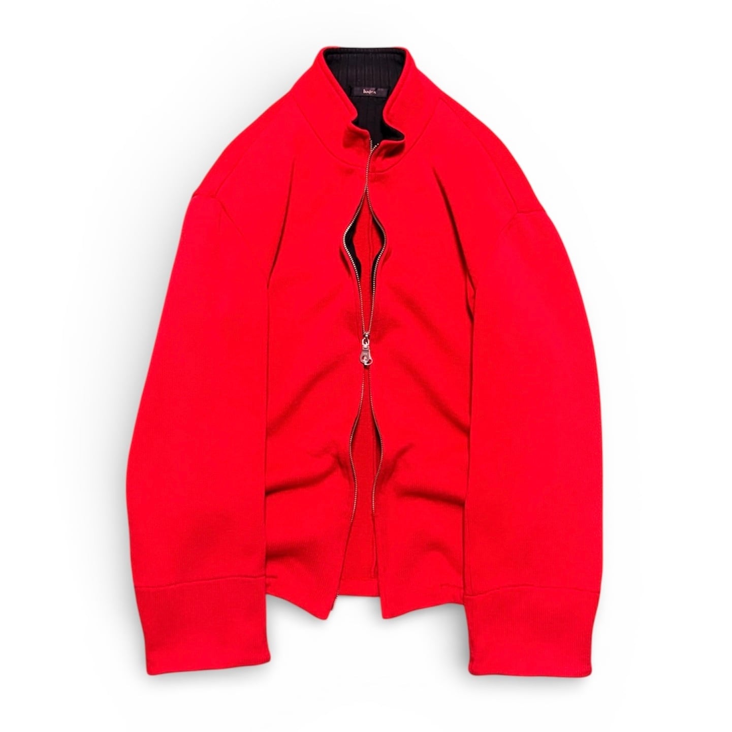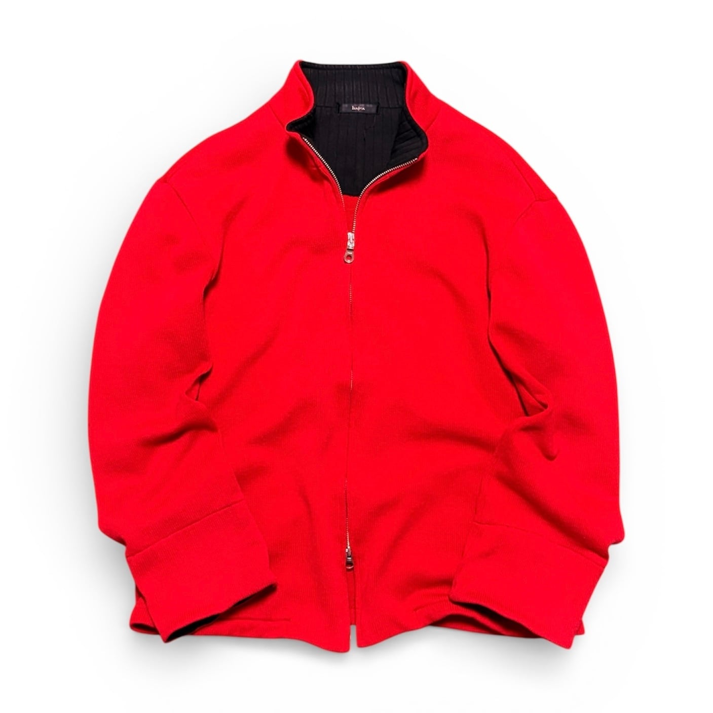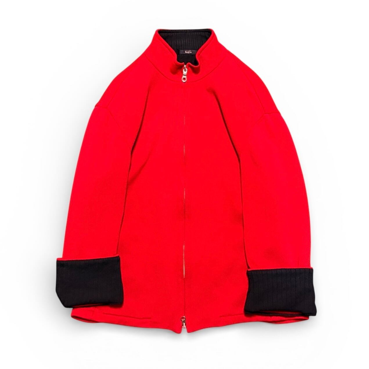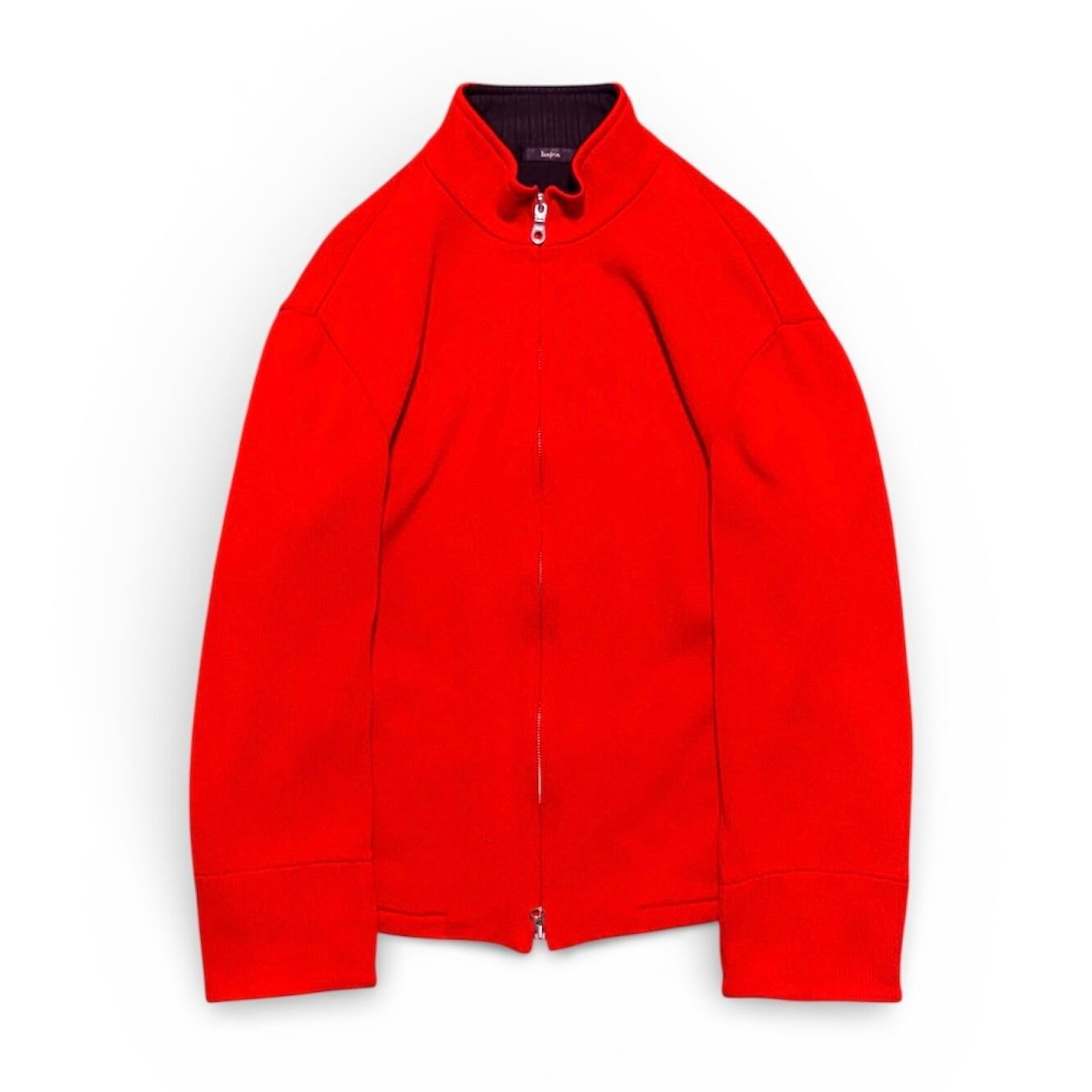 This item is a vivid red driver’s knit with a double-zip closure, designed to be worn much like a lightweight blouson.