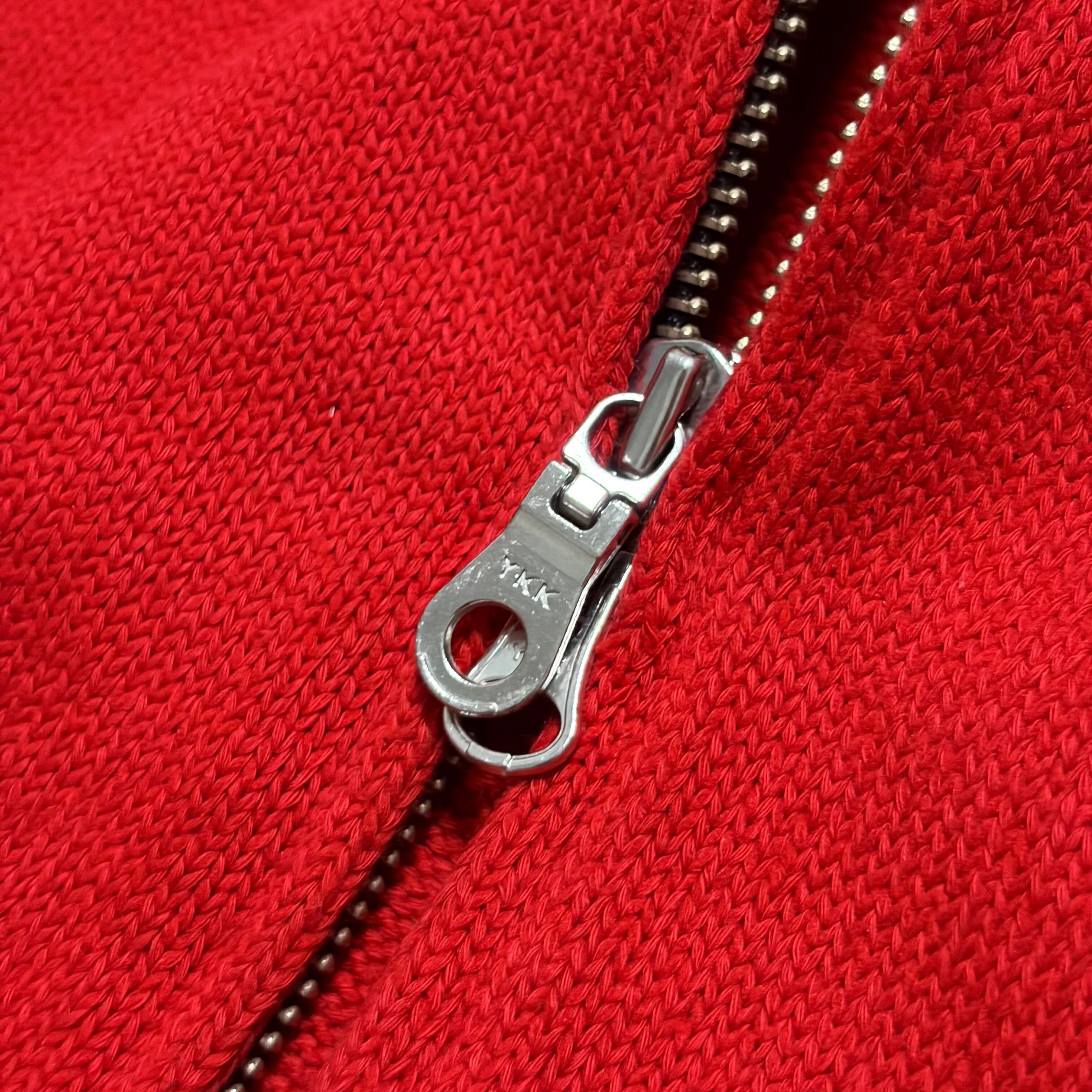 ブルゾン感覚で使えるダブルジップ仕様の真っ赤なドライバーズニットで、袖を折り返すと表情の違う黒いリブニット素材が現れる仕様になっています。